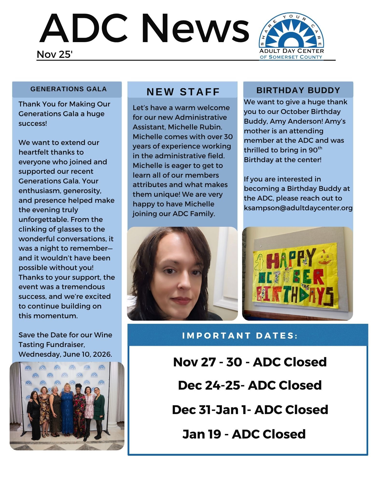 As a reminder, the ADC will be closed on Monday, January 19th in recognition of Martin Luther King Jr. Day. We will reopen at our normal hours on Tuesday, January 20th.